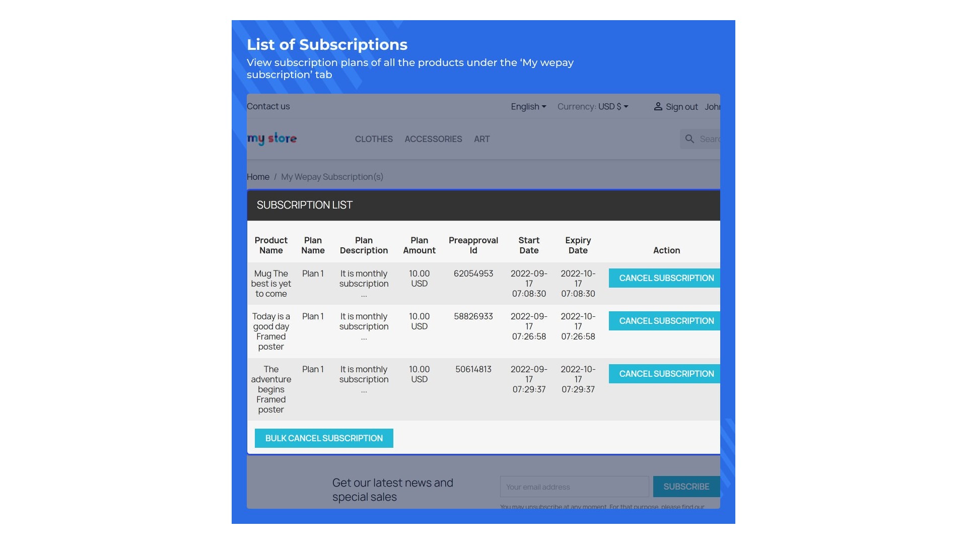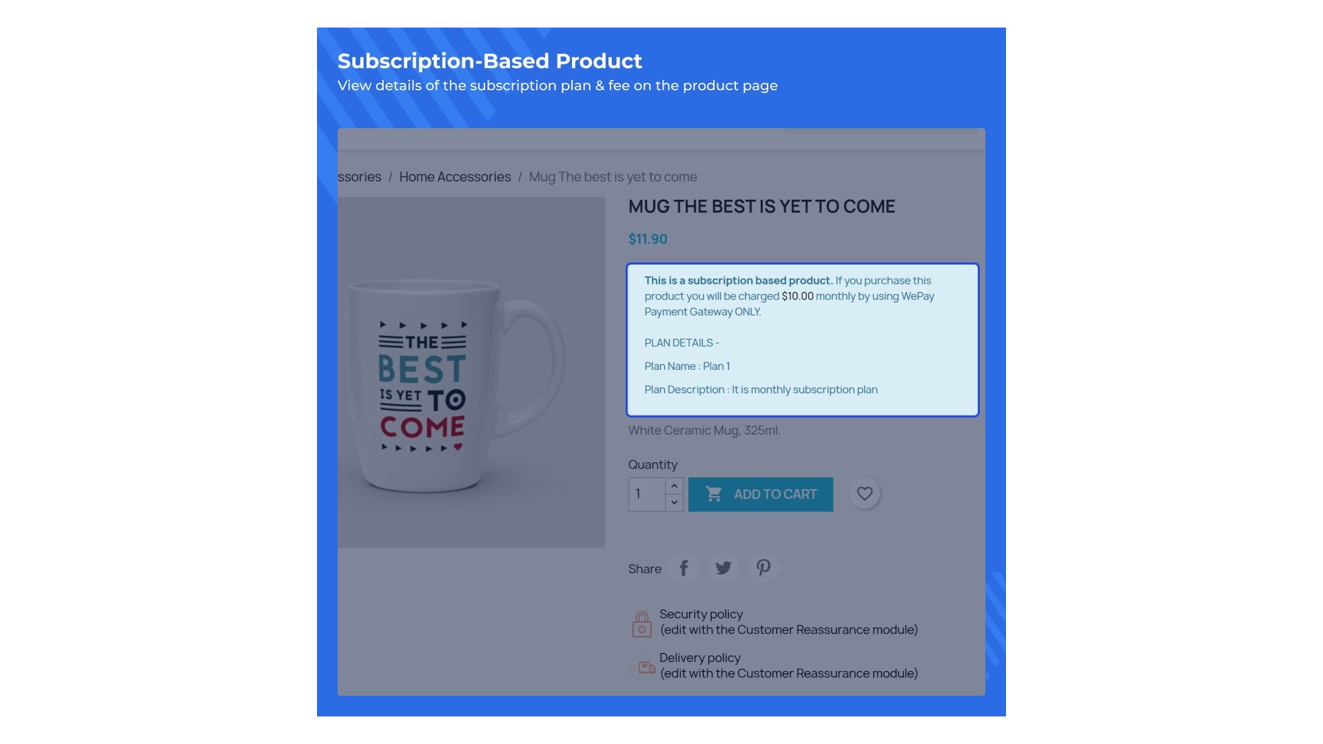 Funkce umožňuje majitelům obchodů vytvářet předplatné plány a přiřazovat je k produktům. Podrobnosti o předplatném plánu jsou viditelné pro zákazníky na stránce produktu, což usnadňuje přihlášení k odběru produktů. Můžete přiřadit více produktů pod jeden předplatný plán.