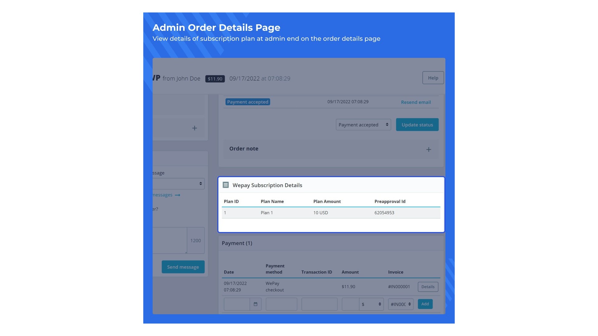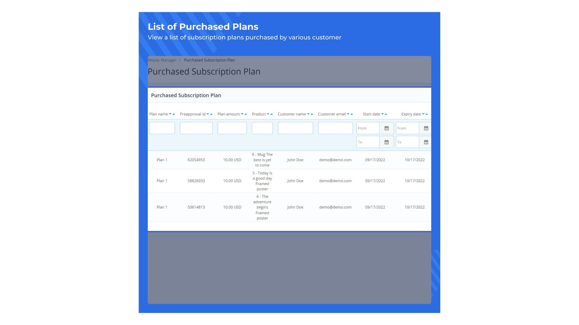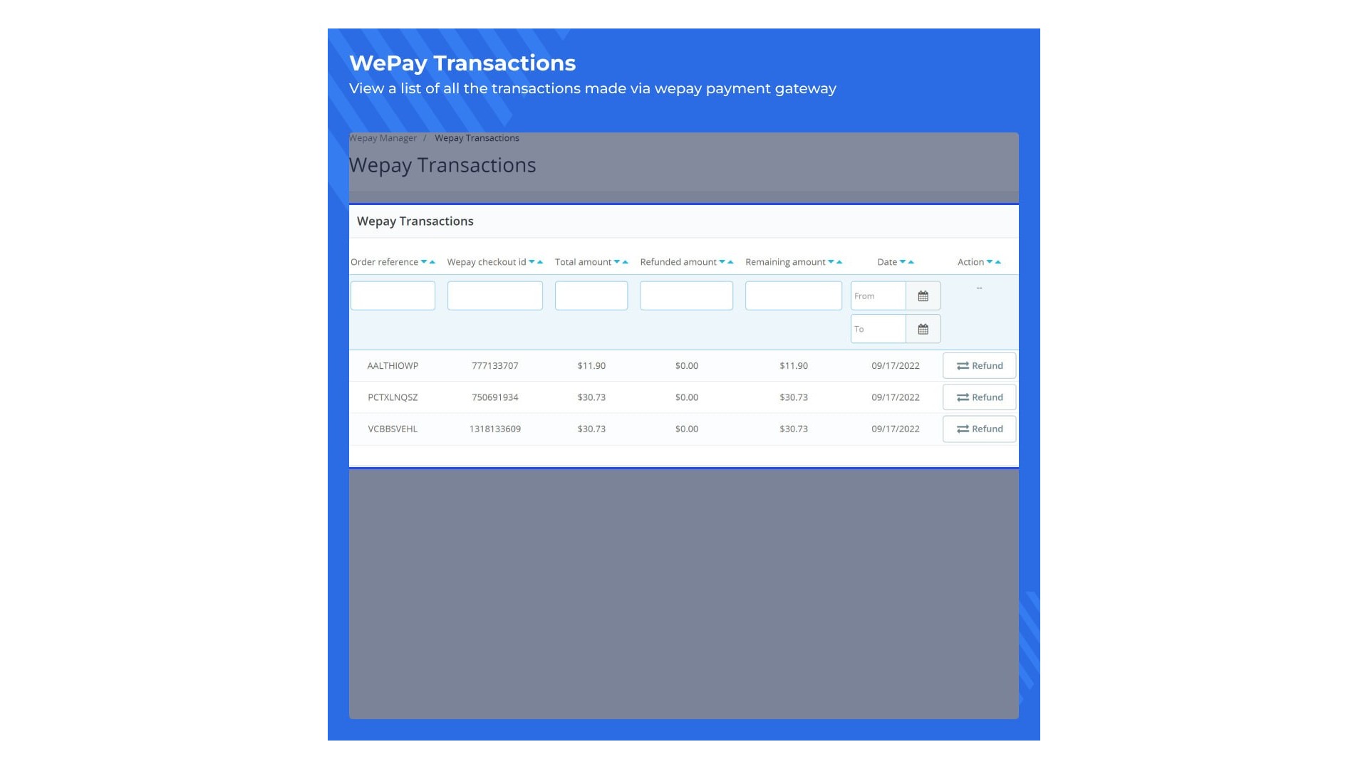 Abychom poskytli správci všechny potřebné údaje a lepší přehled o výkonnosti podnikání, všechny transakce WePay jsou zobrazeny v samostatné sekci. Kromě transakcí WePay jsou k dispozici také podrobnosti o zákaznících a produktech, které si předplatili.