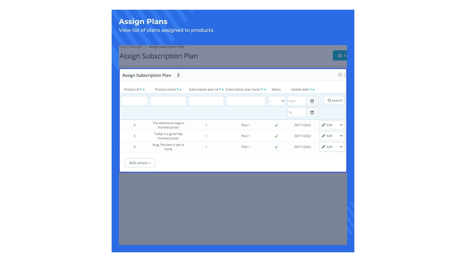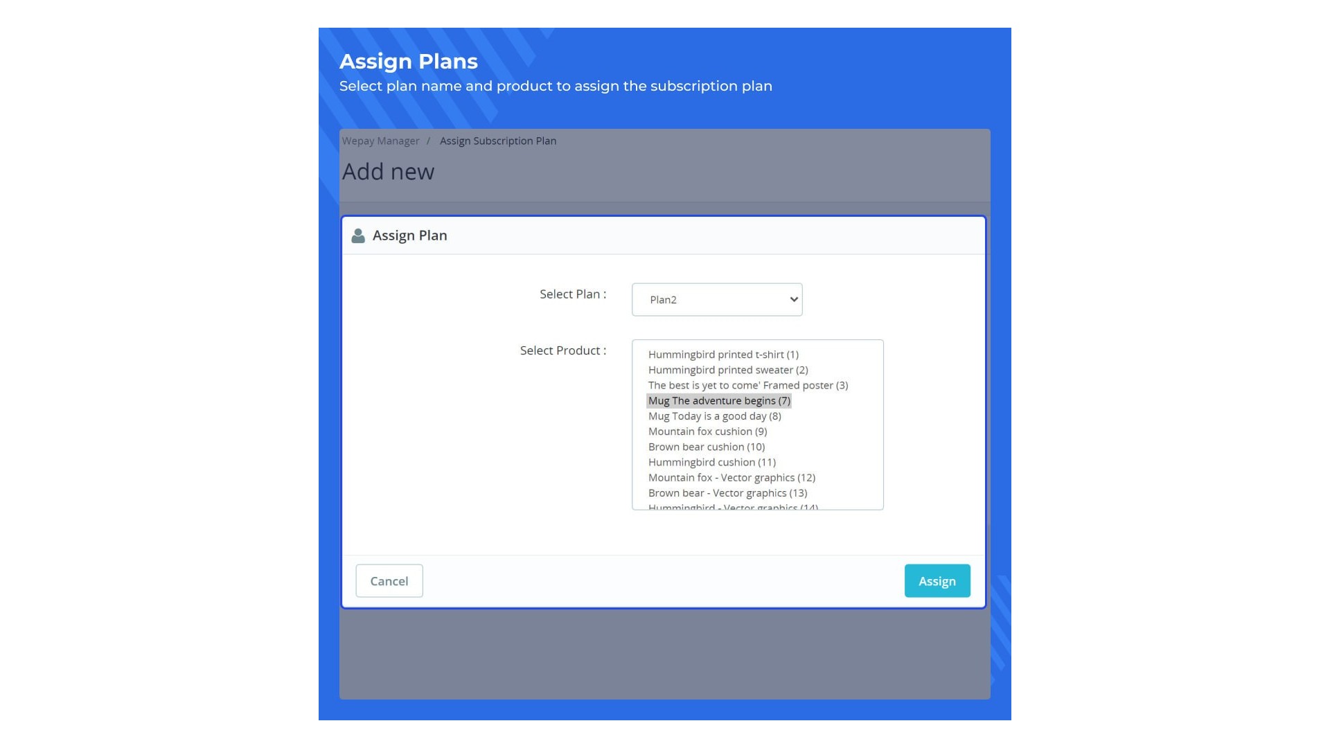 - Správce může přiřadit předplatné plány k jednotlivým nebo více produktům.
