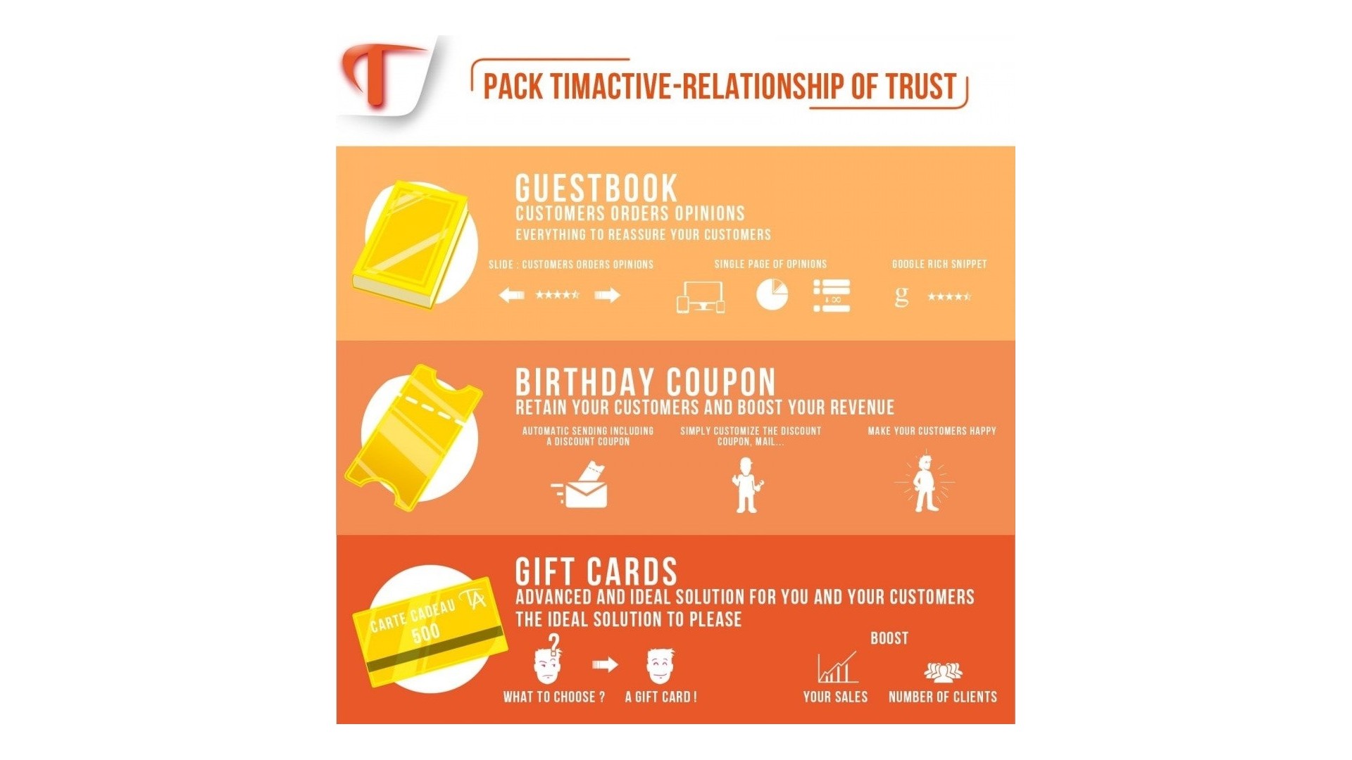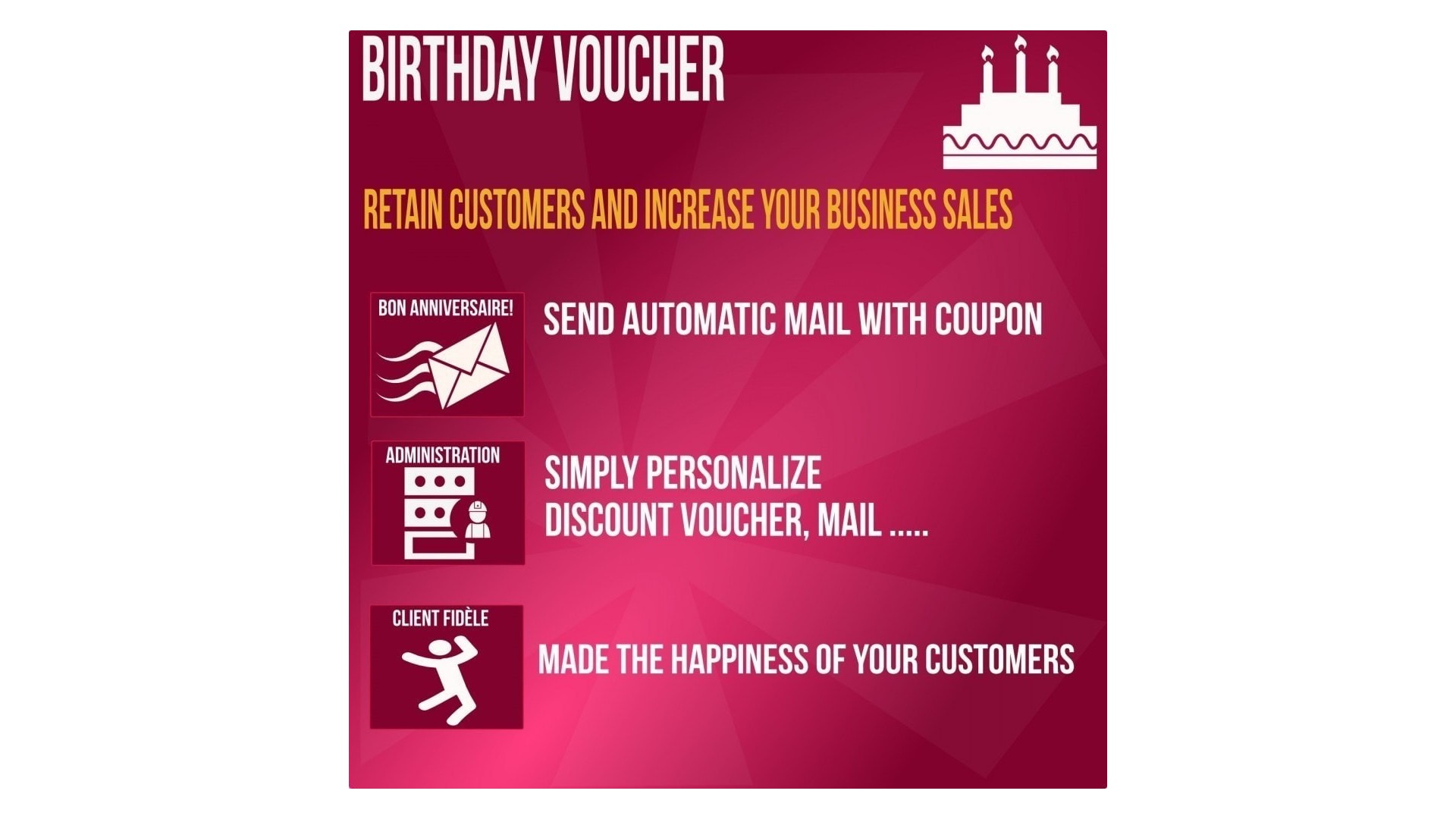Guestbook také slouží k posílení loajality vašich zákazníků. Tato funkce zasílá klientům připomínky, aby se vrátili na webové stránky prostřednictvím pozitivní komunikace, například k jejich narozeninám. Můžete si vybrat, zda chcete oslavit narozeniny zákazníka (datum narození) nebo výročí jejich registrace na stránkách. Funkce nabízí možnost nabídnout výběr bezplatného doručení, procentuální slevy atd., na základě pravidel, která si sami definujete. Tímto způsobem vytváříte privilegovaný vztah se svými zákazníky.