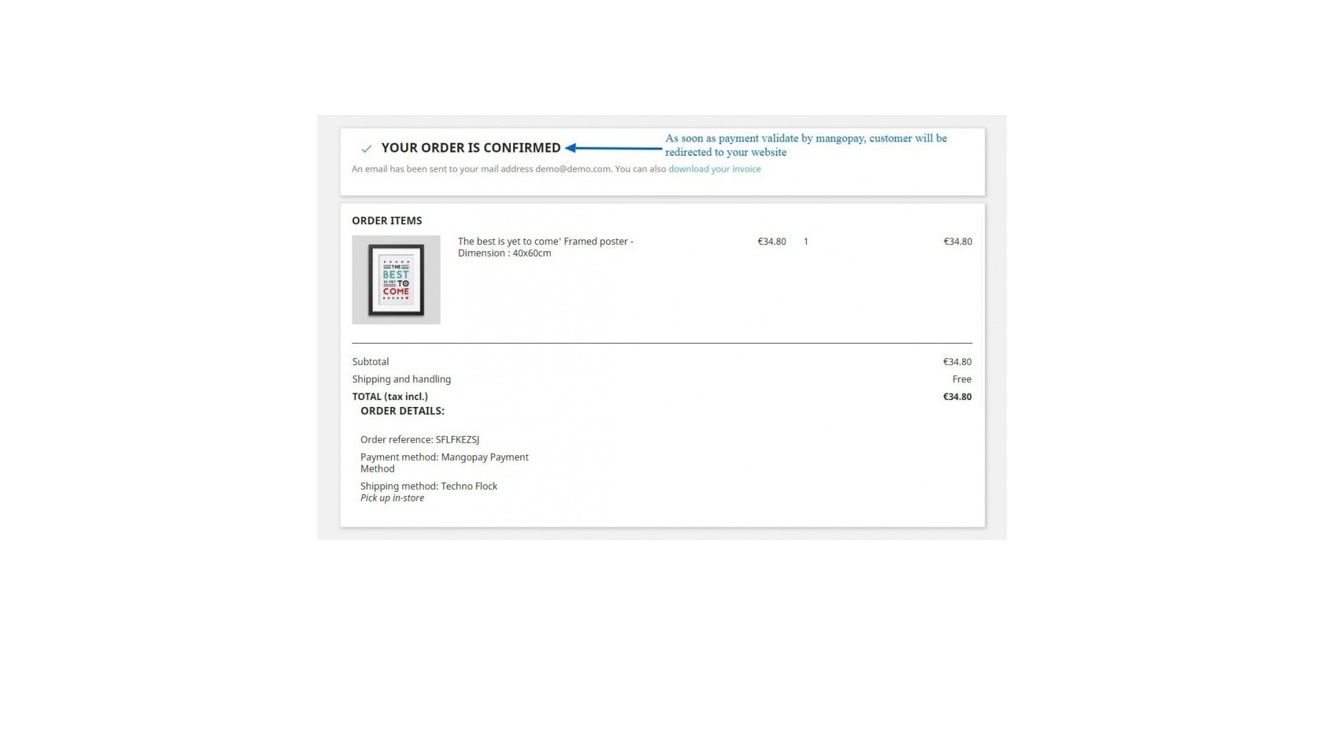 - Webová platba - Zákazník bude přesměrován na zabezpečenou platební stránku Mangopay, odkud se po dokončení platby vrátí zpět do vašeho obchodu.