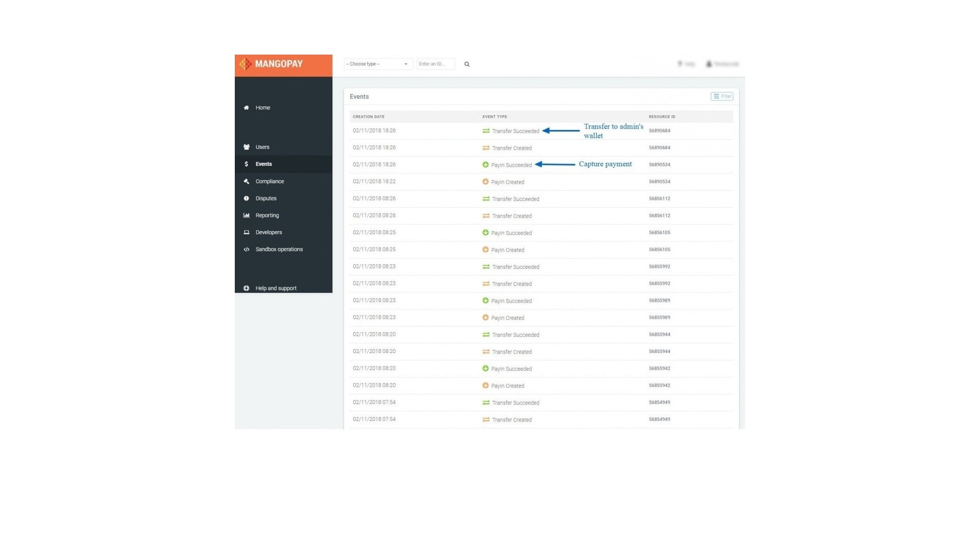 - Seznam všech transakcí provedených prostřednictvím platební metody Mangopay.