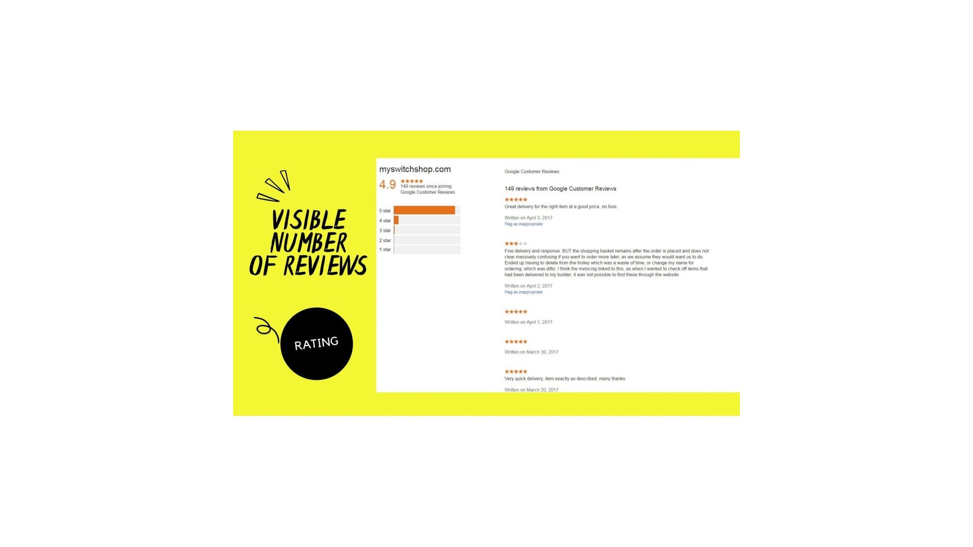 Naše funkce také pozitivně ovlivňuje míru prokliku z výsledků vyhledávání. Přidání hvězdiček do vašeho profilu v Google vyhledávání zajišťuje, že váš obchod vyniká mezi ostatními. Zobrazování zpětné vazby a péče o názory zákazníků přitahuje více návštěvníků a pomáhá vašemu obchodu vyčnívat mezi jinými e-commerce stránkami a dostupnými produkty.