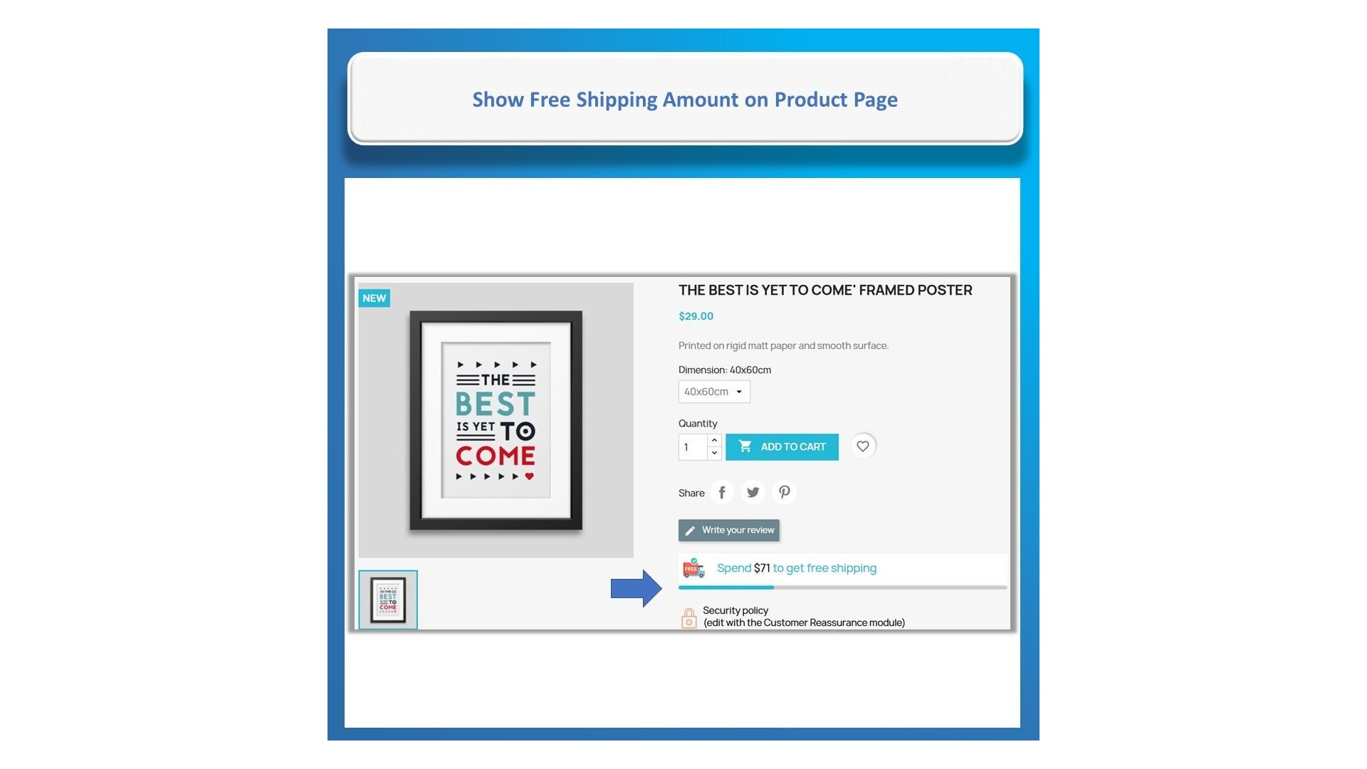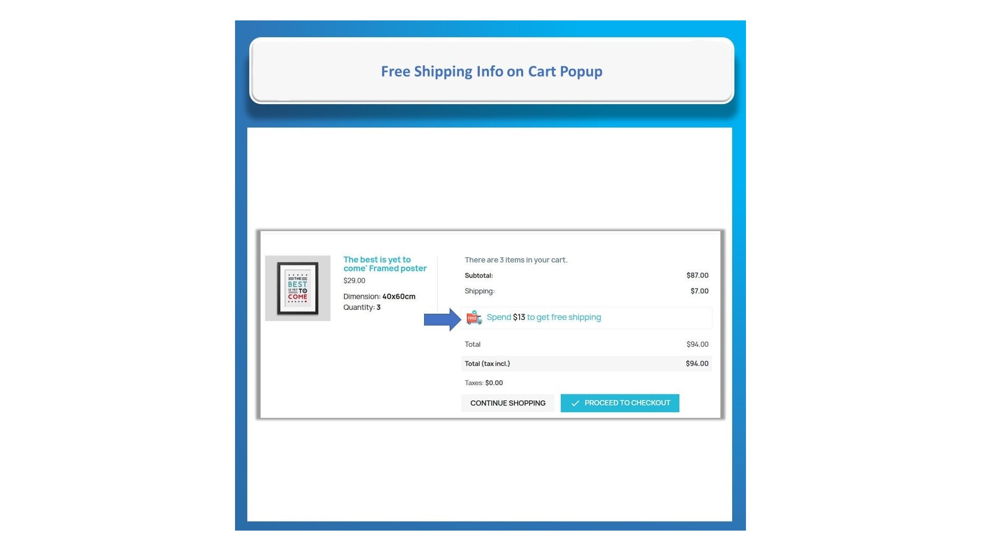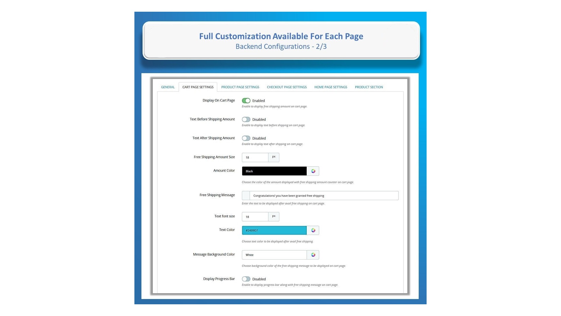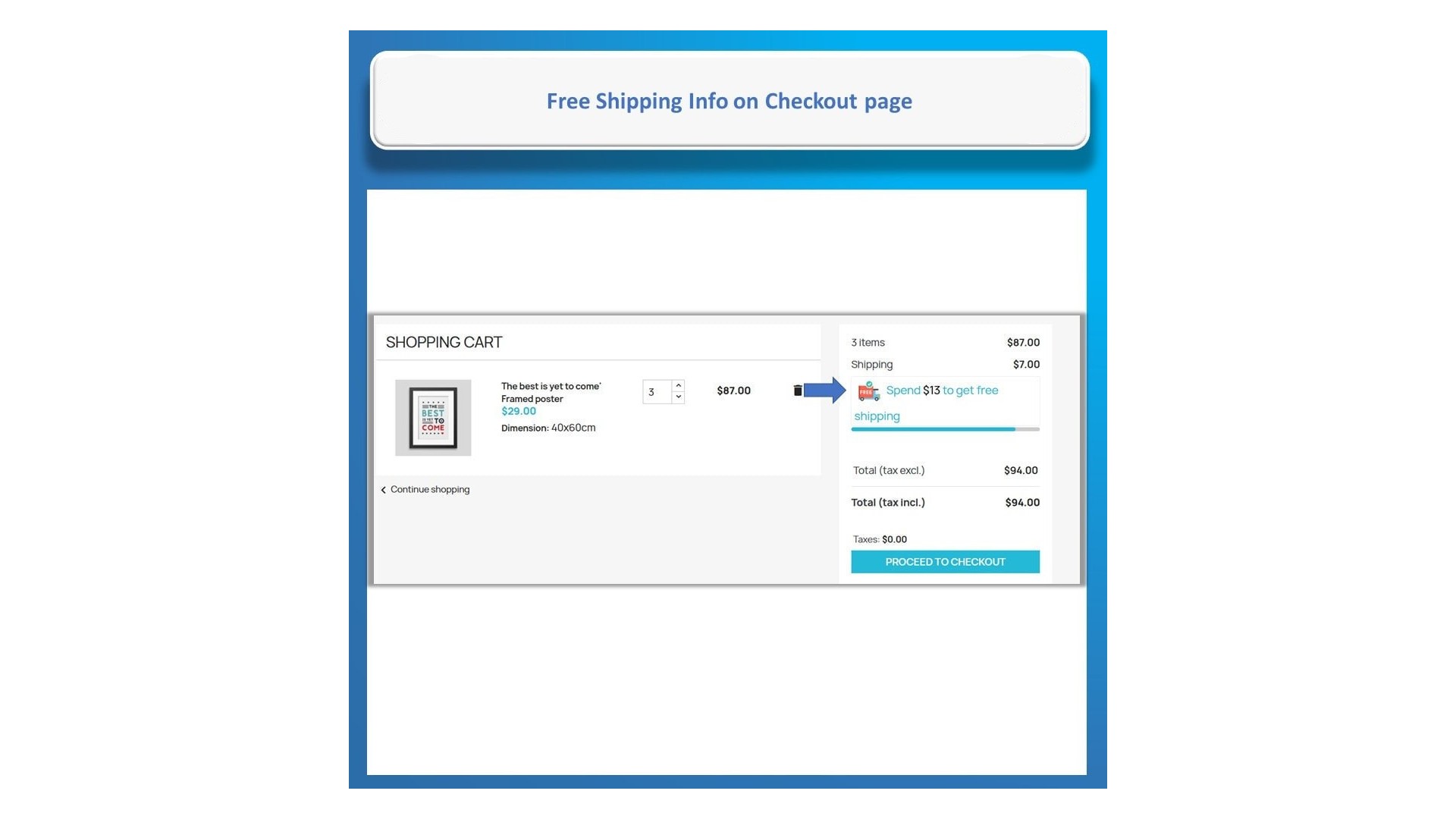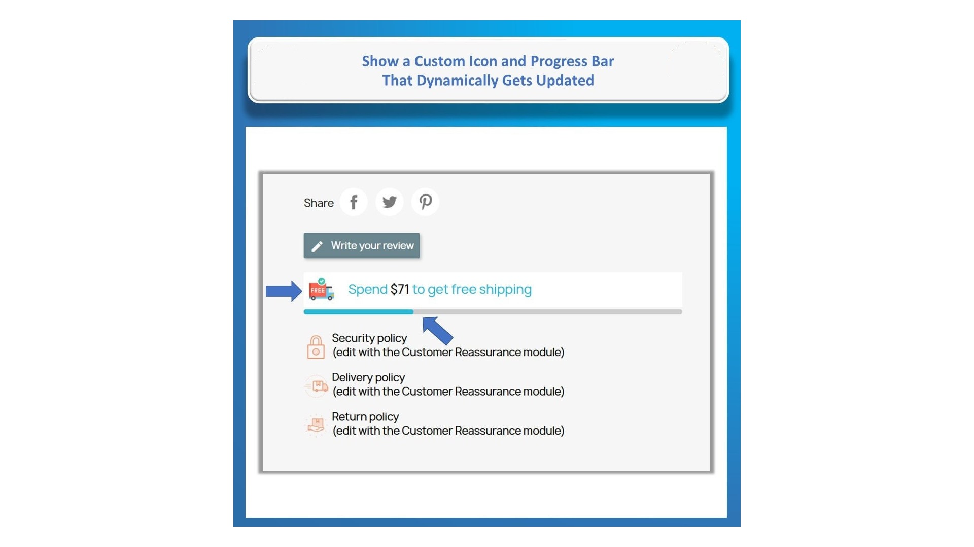 Naše funkce pro sledování zbývající částky pro dopravu zdarma Vám umožní dynamicky zobrazovat zprávu o tom, kolik zbývá do dosažení bezplatné dopravy. Tato funkce je navržena tak, aby motivovala zákazníky k nákupu více produktů, a je k dispozici na domovské stránce, stránkách produktů, vyskakovacích oknech po přidání do košíku, na stránce košíku a při pokladně.