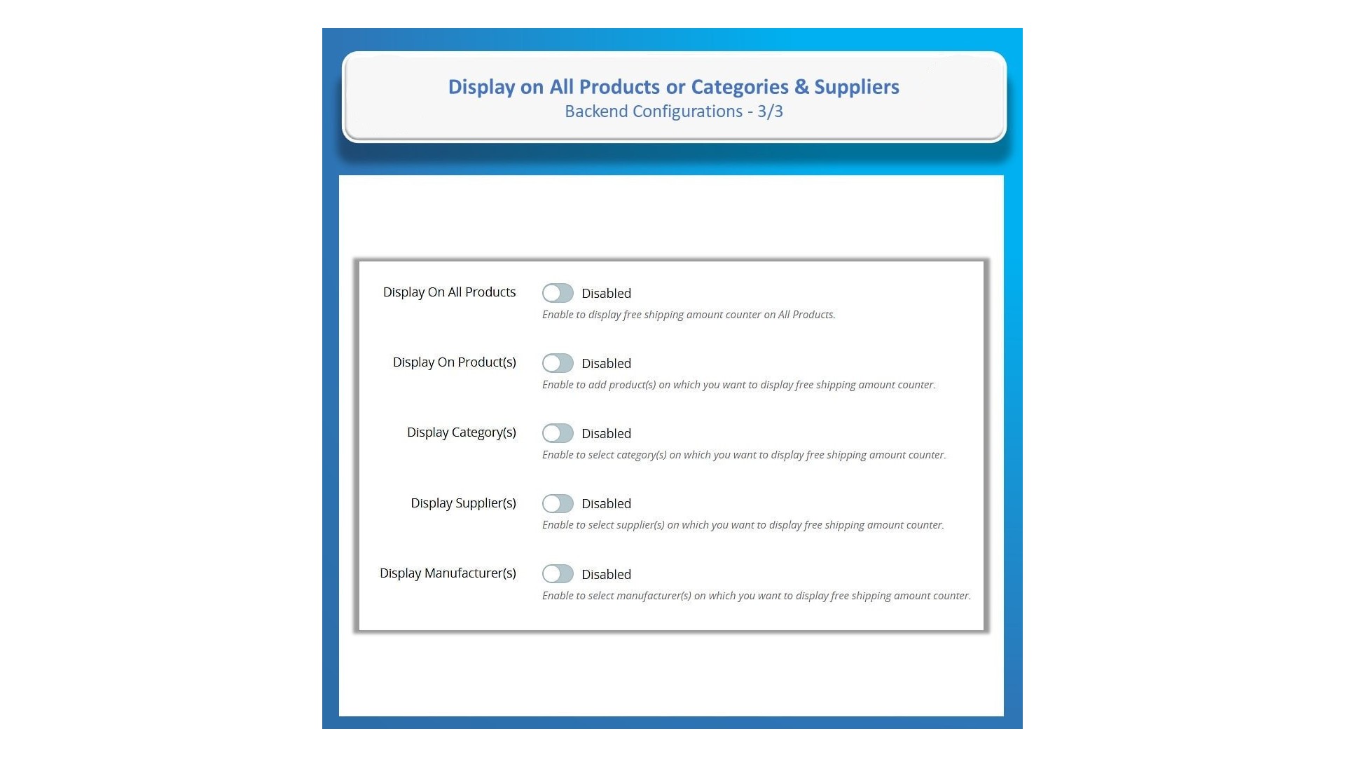 - Možnost zobrazit počítadlo dopravy zdarma na stránkách produktů, v košíku, na domovské stránce a při pokladně.