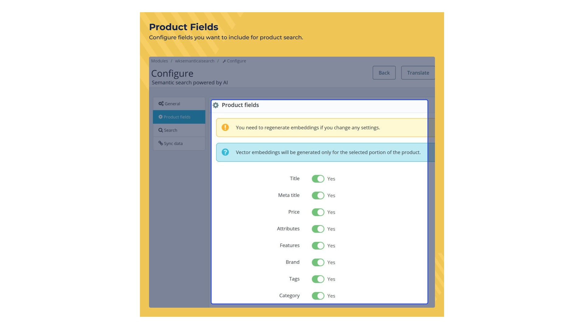 - Možnost zahrnout do vyhledávání název, cenu, atributy, vlastnosti, značky, tagy a kategorie produktů.