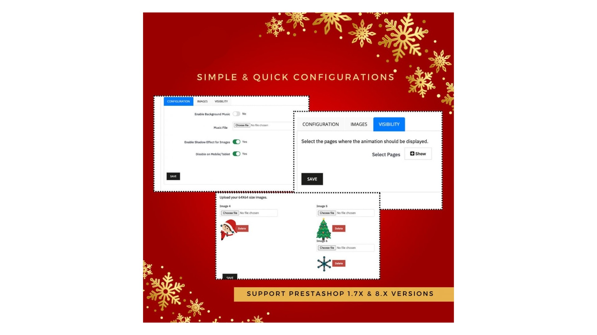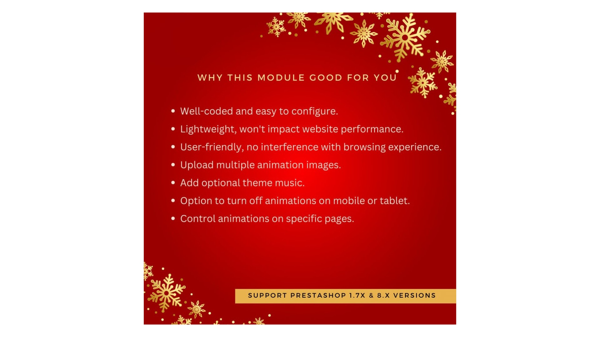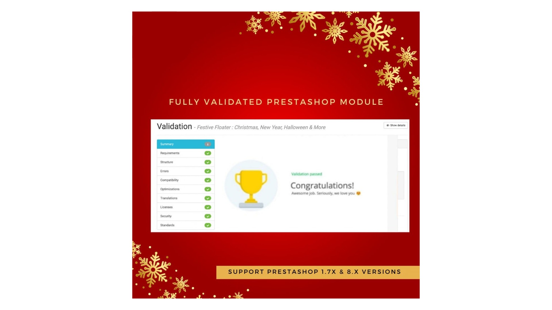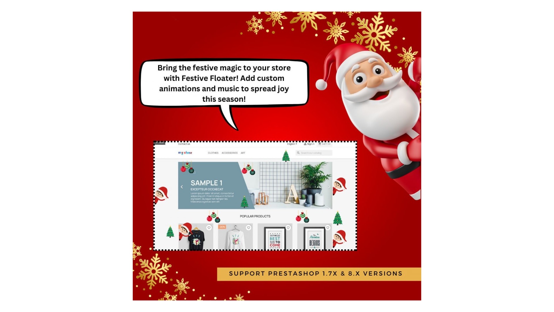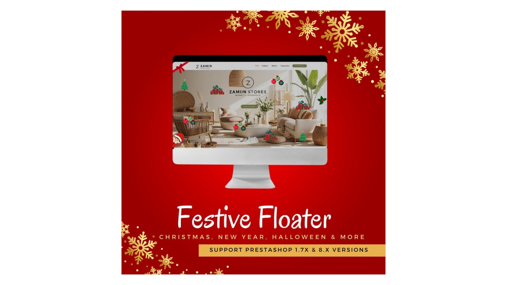 Funkce Festive Floater přidává do vašeho obchodu sezónní kouzlo s animovanými ikonami pro příležitosti jako Vánoce, Nový rok či Halloween. Umožňuje vám nahrát vlastní ikony a hudbu, čímž vytvoříte veselou atmosféru bez narušení uživatelského zážitku, a to vše s možností přizpůsobení zobrazení na různých stránkách.